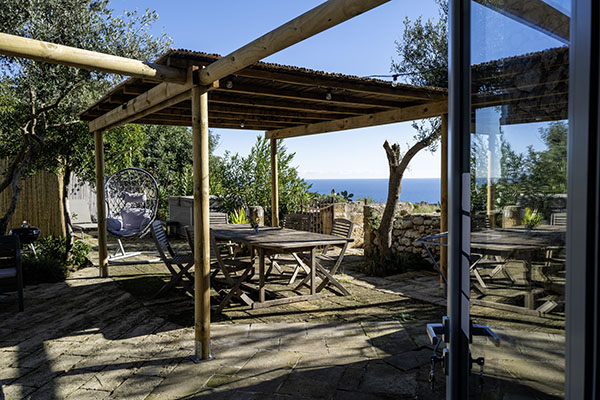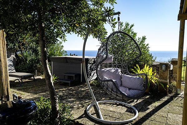 Der gemütlich eingerichtete Außenbereich des Villino lässt keine Wünsche offen. Stets haben Sie das Meer vor Augen, ob Sie nun um den großen Esstisch sitzen, auf den Sonnenliegen, in der Hängematte oder in der Hängeschaukel entspannen oder es sich im Jacuzzi* gut gehen lassen.