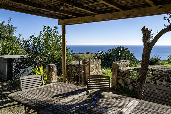 Zu Füßen des 1866 errichteten und 48 m hohen Leuchtturms (Faro) von Santa Maria di Leuca, am südöstlichsten Punkt der italienischen Halbinsel, liegt das hübsche kleine Ferienhaus Villino al Faro. Verborgen zwischen Oliven- und Pinienbäumen ist es der ideale Rückzugsort von Alltag und ungeliebten Routinen. Vor der gemütlichen Terrasse erstrecken sich in satten Farben das Meer und die ca. 100 m hohe Steilküste der Punta Meliso.